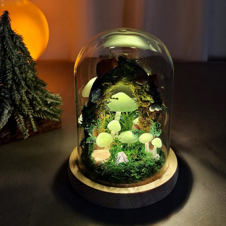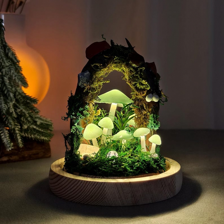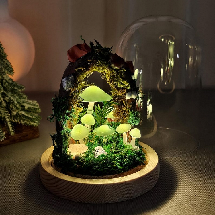 This handmade mushroom night light blends soft LED lighting with real dried flowers, natural moss, and a solid wooden base to create a charming fairytale forest scene. Each piece is thoughtfully crafted to bring warmth, romance, and a cozy glow into any room. Perfect as a heartfelt handmade gift, enchanting home décor, or a gentle bedside night light.