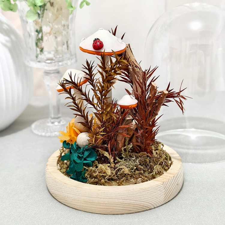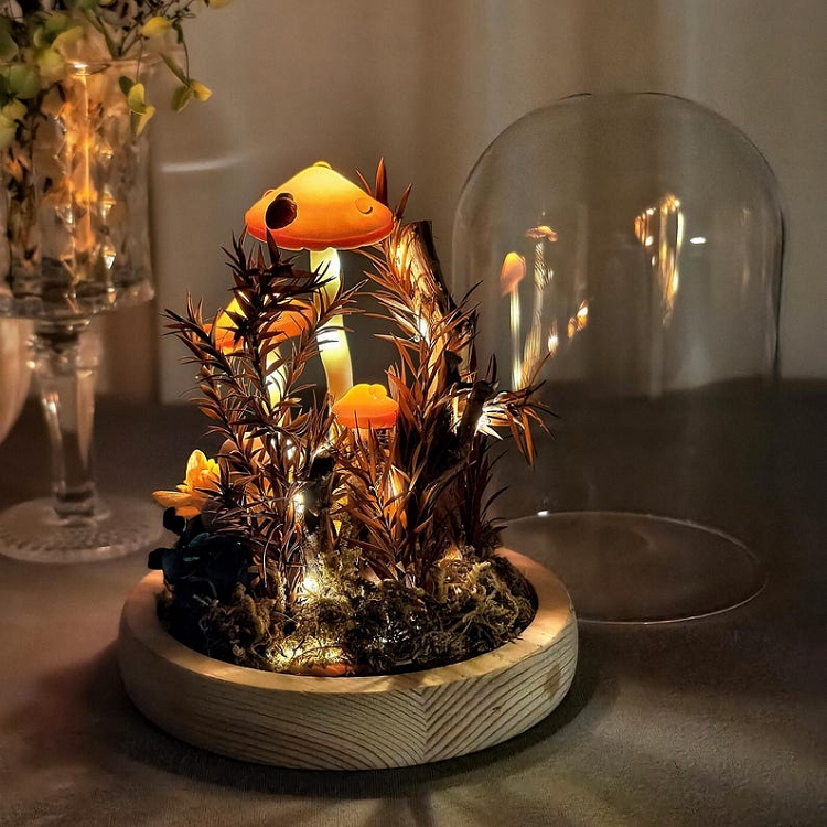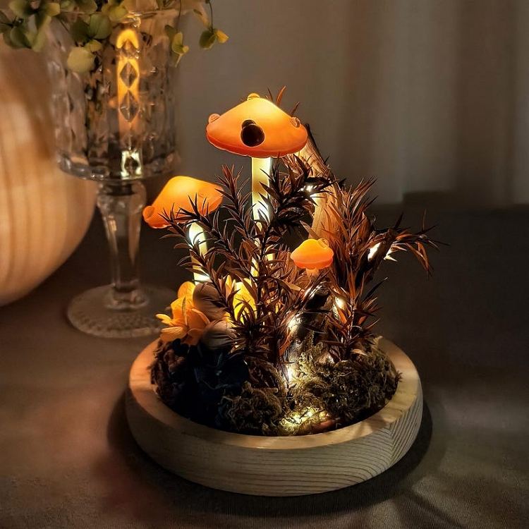 This handmade mushroom night light blends soft LED lighting with real dried flowers, natural moss, and a solid wooden base to create a charming fairytale forest scene. Each piece is thoughtfully crafted to bring warmth, romance, and a cozy glow into any room. Perfect as a heartfelt handmade gift, enchanting home décor, or a gentle bedside night light.