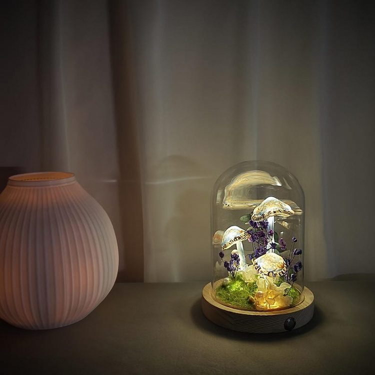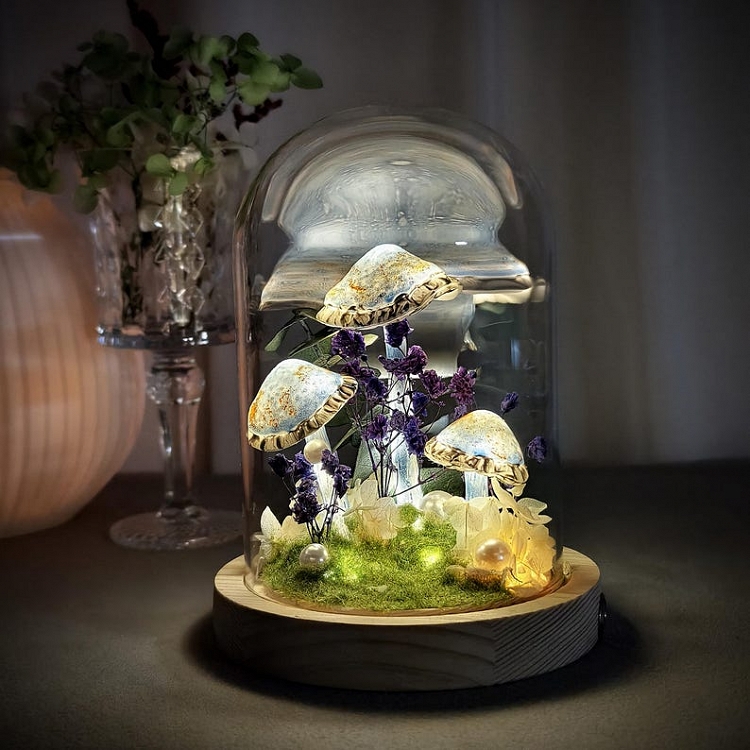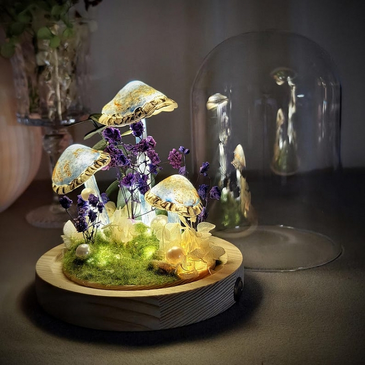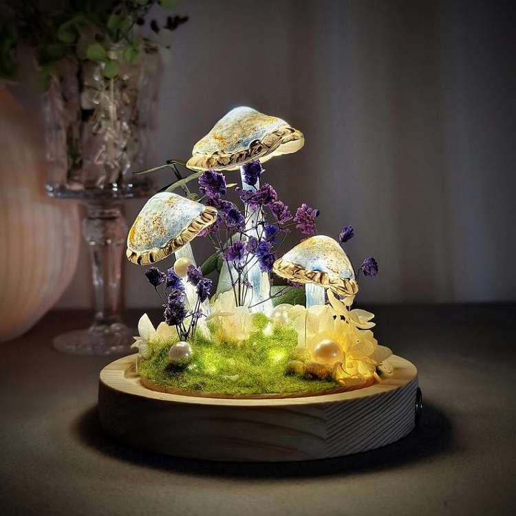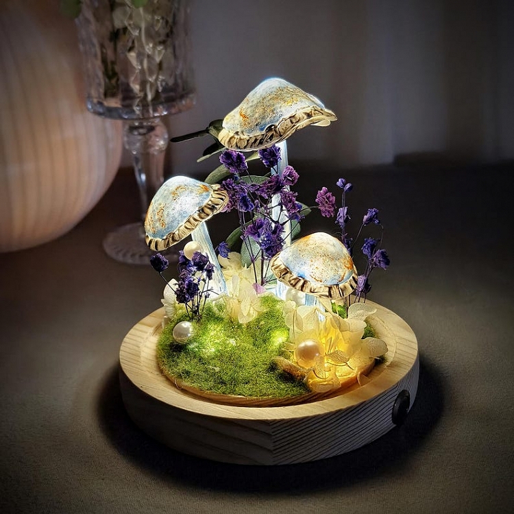 This handmade mushroom night light blends soft LED lighting with real dried flowers, natural moss, and a solid wooden base to create a charming fairytale forest scene. Each piece is thoughtfully crafted to bring warmth, romance, and a cozy glow into any room. Perfect as a heartfelt handmade gift, enchanting home décor, or a gentle bedside night light.