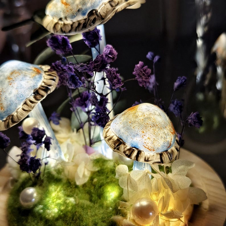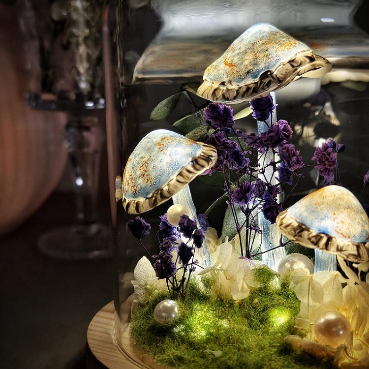 Each lamp is 100% handmade, so every mushroom shape and botanical arrangement is truly one of a kind.
