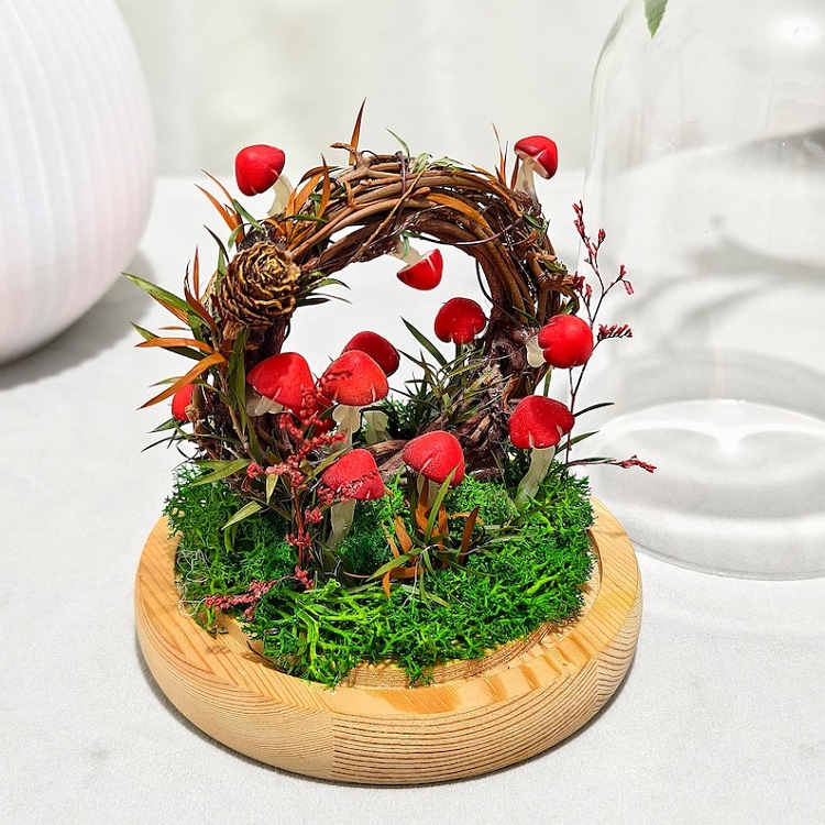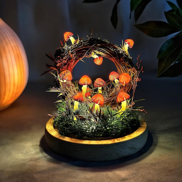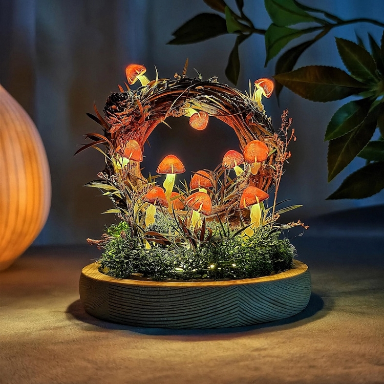 This handmade mushroom night light blends soft LED lighting with real dried flowers, natural moss, and a solid wooden base to create a charming fairytale forest scene. Each piece is thoughtfully crafted to bring warmth, romance, and a cozy glow into any room. Perfect as a heartfelt handmade gift, enchanting home décor, or a gentle bedside night light.