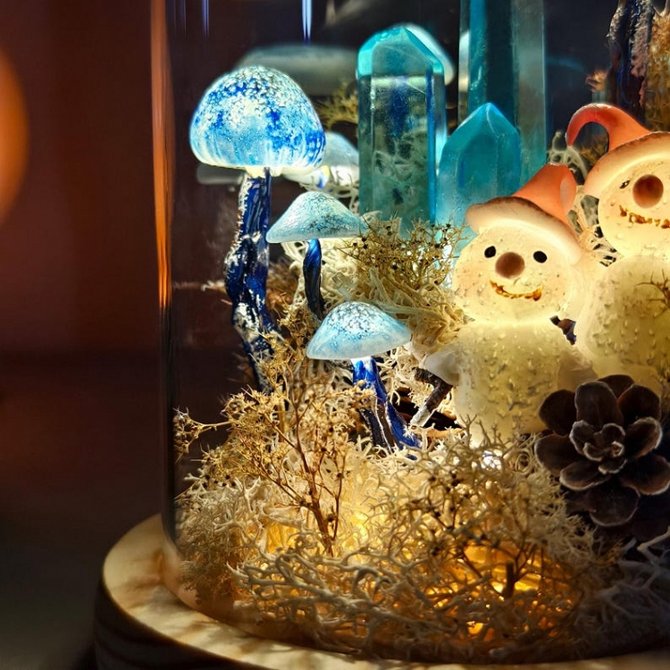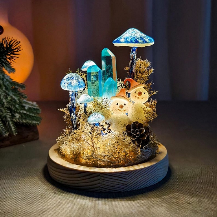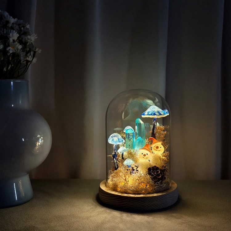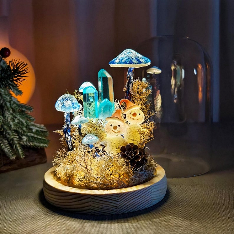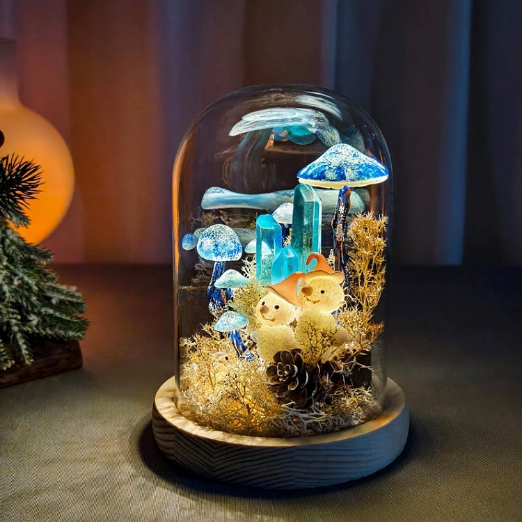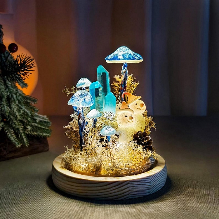 This handmade mushroom night light blends soft LED lighting with real dried flowers, natural moss, and a solid wooden base to create a charming fairytale forest scene. Each piece is thoughtfully crafted to bring warmth, romance, and a cozy glow into any room. Perfect as a heartfelt handmade gift, enchanting home décor, or a gentle bedside night light.