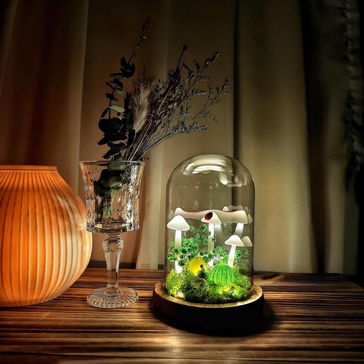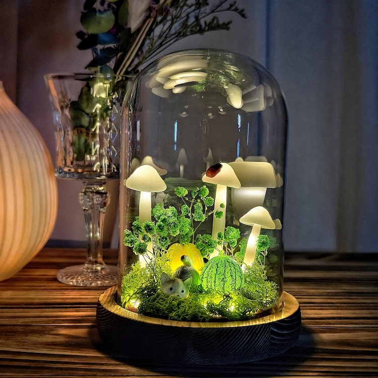 This handmade mushroom night light blends soft LED lighting with real dried flowers, natural moss, and a solid wooden base to create a charming fairytale forest scene. Each piece is thoughtfully crafted to bring warmth, romance, and a cozy glow into any room. Perfect as a heartfelt handmade gift, enchanting home décor, or a gentle bedside night light.