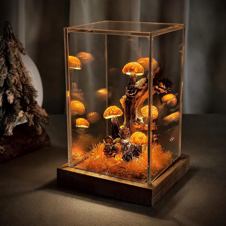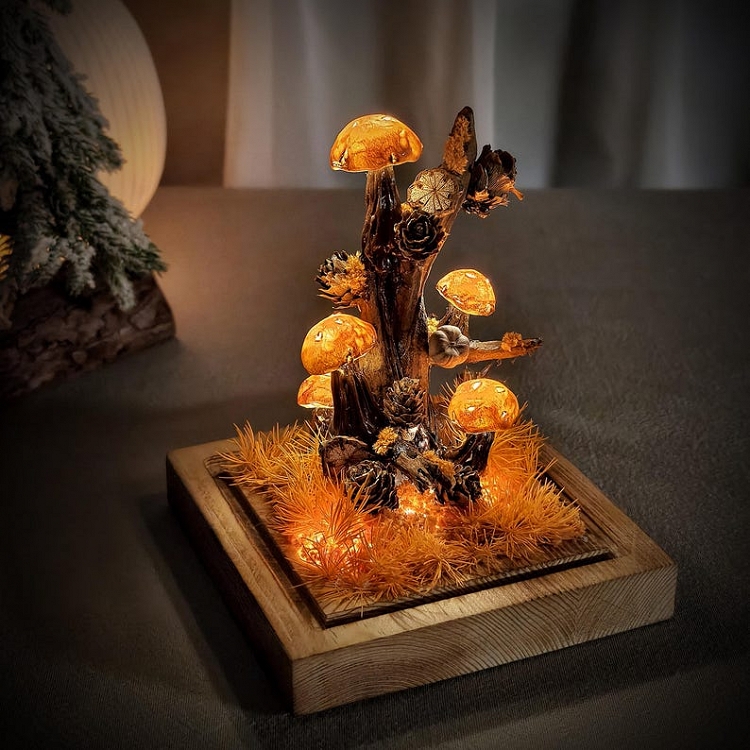 This handmade mushroom night light blends soft LED lighting with real dried flowers, natural moss, and a solid wooden base to create a charming fairytale forest scene. Each piece is thoughtfully crafted to bring warmth, romance, and a cozy glow into any room. Perfect as a heartfelt handmade gift, enchanting home décor, or a gentle bedside night light.