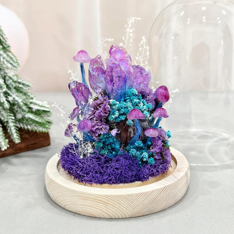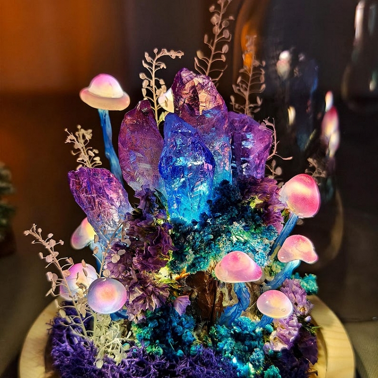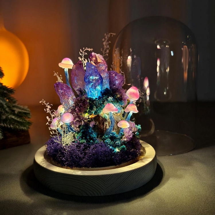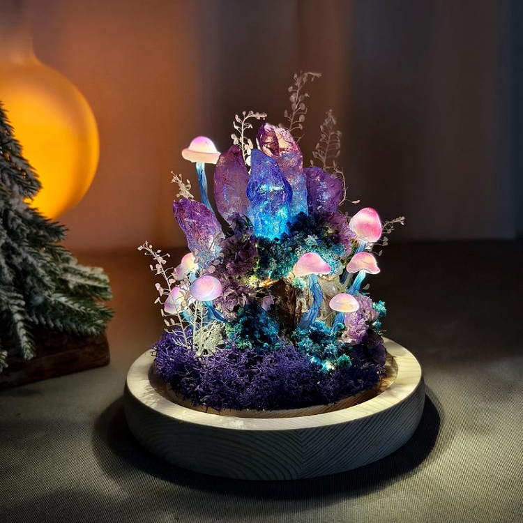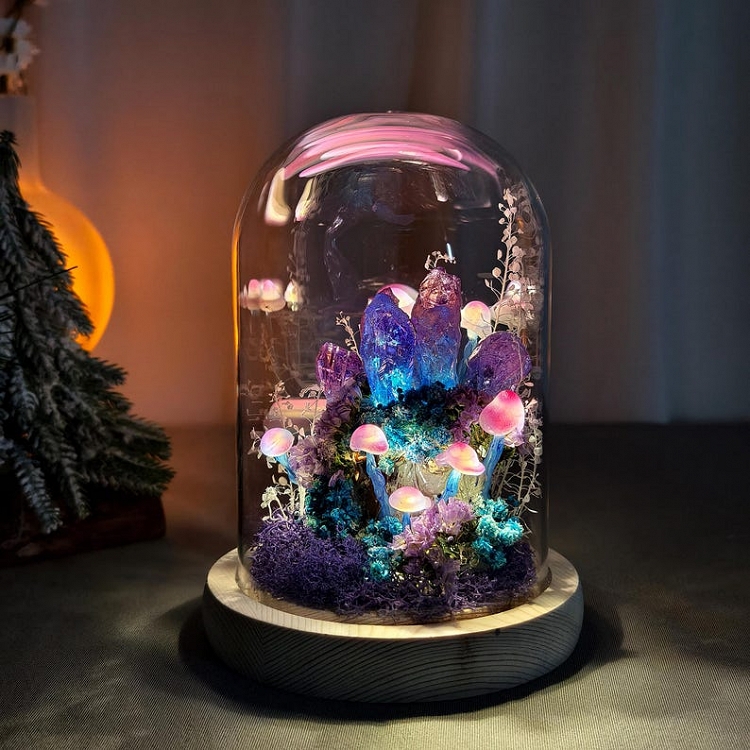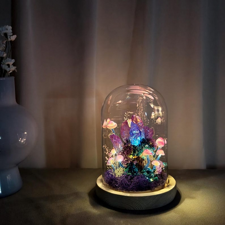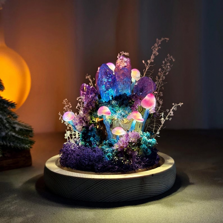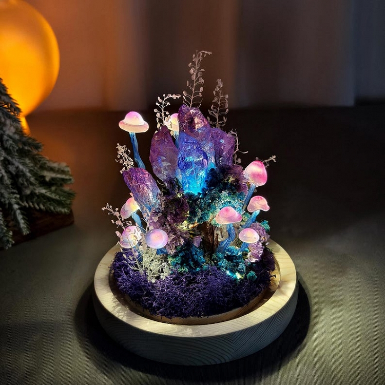 This handmade mushroom night light blends soft LED lighting with real dried flowers, natural moss, and a solid wooden base to create a charming fairytale forest scene. Each piece is thoughtfully crafted to bring warmth, romance, and a cozy glow into any room. Perfect as a heartfelt handmade gift, enchanting home décor, or a gentle bedside night light.